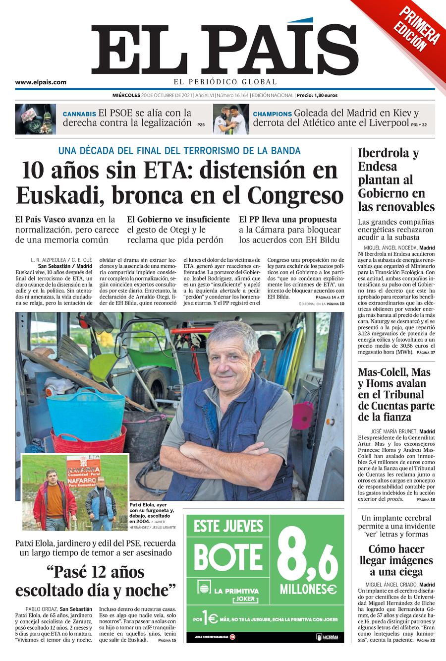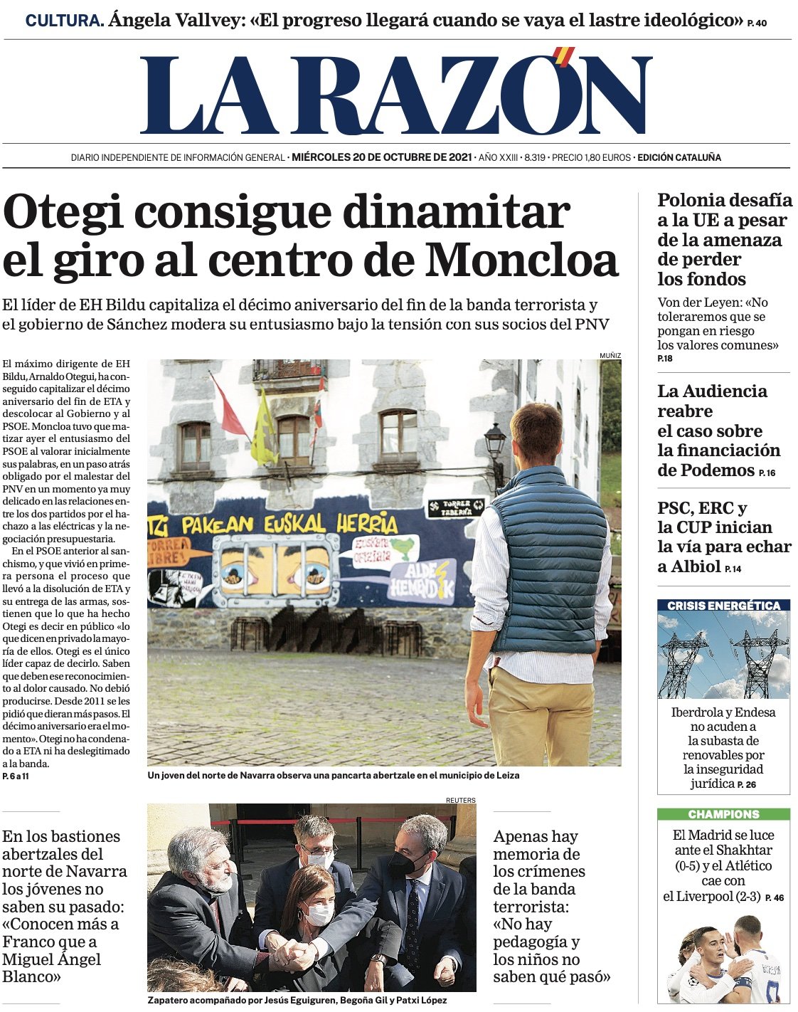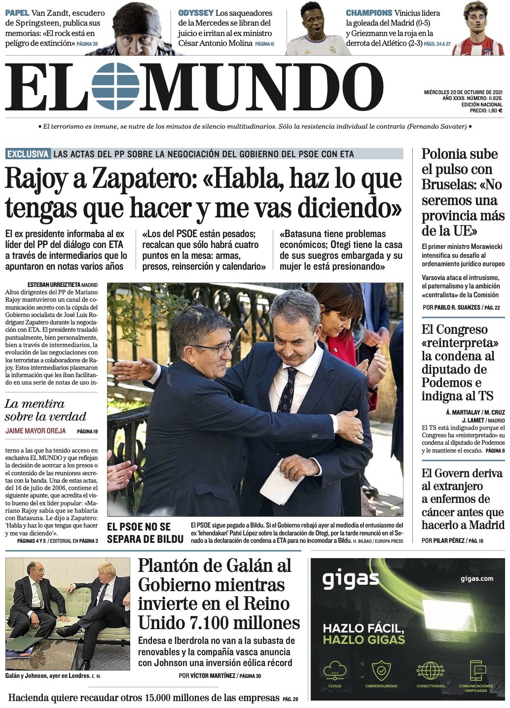 Diu El Mundo que Mariano Rajoy s’hi va posar bé en els contactes que el govern de José Luis Rodríguez Zapatero volia mantenir amb l’organització terrorista ETA de cara a la seva dissolució, allà cap al 2006. La veritat és que la resposta de Rajoy que obre la portada del diari és una gallegada de bona qualitat. Tu ves fent el que et sembli i ja em diràs com va, li diu a Zapatero. És a dir, que no se sap si el llavors líder de l’oposició aprova o desaprova els contactes, encara que el diari ho fa passar com si Rajoy els acceptés implícitament. No s’hi va oposar frontalment, com fins ara explicava la narrativa del PP sobre aquelles negociacions. El diari deixa al descobert la hipocresia del PP en aquest cas. Ara tot és escandalitzar-se per la declaració d’Arnaldo Otegi d’aquest dilluns. Abans tot era xiular i mirar al sostre: si sortia bé, m’apunto a l’èxit (és una “política d’Estat”), i si surt malament, assenyalo el PSOE com una colla de vendepatrias. Win-win.