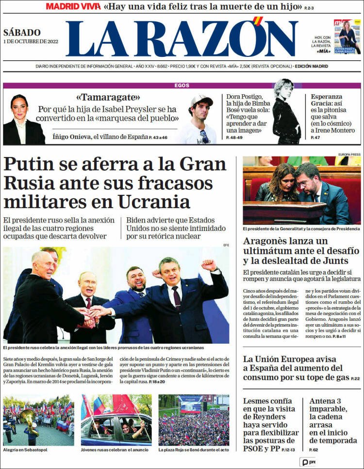 I amb Putin, l’aniversari de l’1-O. Un fet que dona peu a El Mundo per fer sang, en la línia que el caracteritza. “1-O: la ferida de la democràcia que manté presa la política espanyola”, sentència el rotatiu madrileny que insisteix un dia més en el seu mantra que l’independentisme és el principal aliat del govern de Pedro Sánchez. L’altre diari del trio de la benzina, La Razón posa més èmfasi amb la crisi del Govern i l’ultimàtum de Pere Aragonès a Junts “davant el desafiament i la deslleialtat de Junts”. Vaja, que ara pels de Maruhenda, Esquerra és l’ordre i els juntaires són els dolents. Qui ho havia de dir!