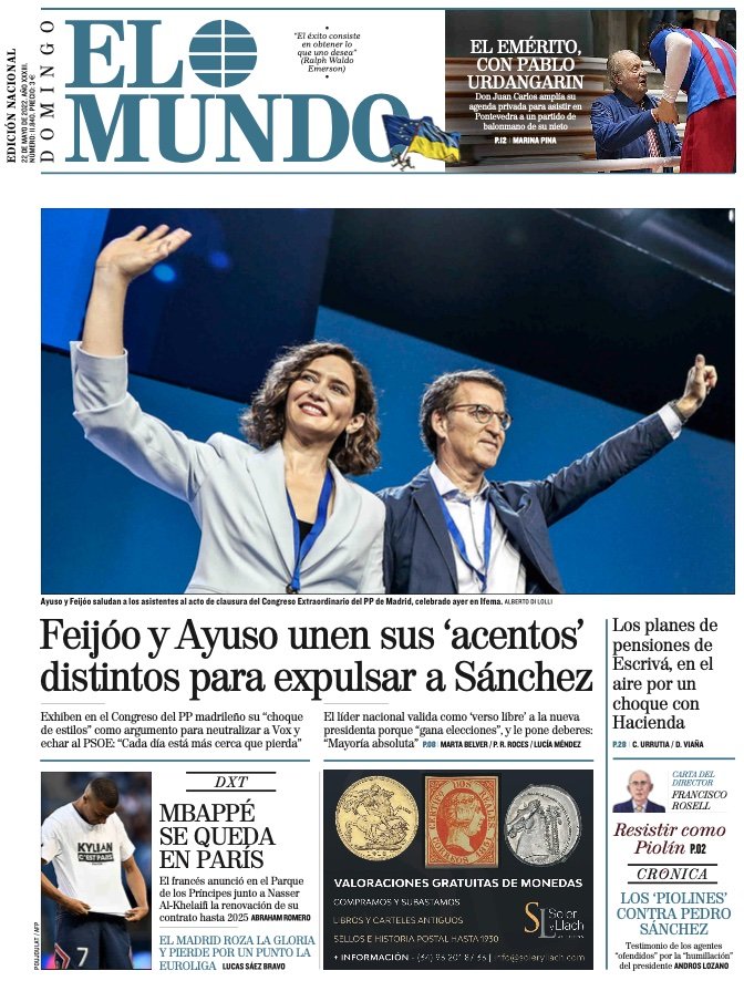 Ayuso no té manies: és la dreta dura que busca brega, pacta amb Vox i manipula i torç la veritat i els fets quan li convé. Feijóo no és res de tot això, més aviat al contrari. Els dos han guanyat molt bé a les respectives regions, Madrid i Galícia, i així es presenten com a models a seguir pel partit a nivell estatal. La cosa és que Ayuso ha capturat —o ha estat capturada, fa de mal dir— pels interessos econòmics que al Gran Madrid es fan i es desfan, i ha cooptat a gairebé tots els mitjans de comunicació i als columnistes i tertulians que es pentinen i van de dol, plogui o faci sol. Feijóo queda com a majordom mentre el PP normalitza poc a poc el nou estatus polític del què n’és protagonista: les coalicions d’octanatge divers amb Vox a Castella-Lleó, Madrid i la imminent a Andalusia.