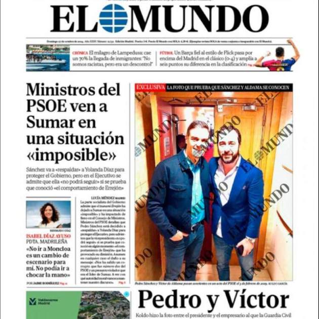 El Mundo és el rei de les portades d’aquest diumenge, amb una exclusiva que deixa retratat Pedro Sánchez. Mai millor dit, la notícia és una fotografia del president del govern espanyol i el cervell de la trama de les mascaretes Víctor de Aldama, junts i somrients, en una imatge captada en un acte del PSOE en febrer del 2019. Però és que, a més, la fotografia està signada ni més ni menys que per Koldo García, que se suposa que va ser qui va captar l’instant que, com destaca el rotatiu, demostra que el president del govern sí que coneixia l'aconseguidor Aldama, a qui la UCO considera el “nexe corruptor” de la trama i que es troba actualment en presó incomunicada a Soto del Real per un altre cas, el frau de 182 milions d’euros en una operació vinculada als hidrocarburs. La fotografia comprometedora data del 2019, abans que la pandèmia arribés a Espanya. Aquestes informacions apareixen en mig de les informacions que assetgen el govern de Sánchez pels seus propis casos que el vinculen a la corrupció (l’exministre i qui va ser la seva mà dreta José Luis Ábalos, la seva dona Begoña Gómez, el seu germà David), l’embolic judicial del fiscal general Álvaro García Ortiz, imputat pel Suprem, i la crisi de Sumar, els seus socis al govern, arran de l’escàndol del cas Errejón, que encara cueja.