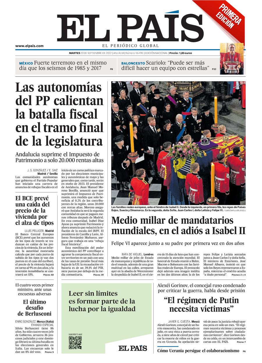 El diari de referència de Catalunya no atorga el títol principal al funeral d’Elisabet II. Li dona a un dels temes que més fan salivar al diari: els impostos —encara que sempre després dels temes relacionats amb el diàleg, el pacte, la moderació, la concòrdia, etcètera, etcètera. Andalusia ha fet un Ayuso i eliminarà l’impost de patrimoni “per atreure catalans”. Val a dir que es tracta d’una determinada mena de catalans: prínceps i prohoms, gent que potser mai s’ha netejat les sabates ni mai s’ha fet el llit. No hi ha manera de saber si el títol és una mena de crit d’alarma del diari o una expressió del seu malestar, de la seva alegria o de la seva inquietud. El País, en canvi, que també obre amb aquest afer, explica que la mesura beneficia tot just a 20.000 rendes altes d’Andalusia, el 0,2% dels contribuents de la regió. La gràcia d’aquestes mesures —com la d’eliminar l’impost de successions, per exemple— no és que milloren la teva vida, que no la milloren, sinó que agraden molt tothom perque són aspiracionals: ningú pensa que no serà ric i, si és així, vol pagar com menys impostos millor. El diari espanyol de referència ho situa en el seu context polític: el PP, a través de les autonomies, vol enviar-te el missatge que faran el mateix si arriben a governar Espanya. Rebaixar impostos sense cap més acompanyament vol dir que els serveis públics o les prestacions socials es retallaran o que els salaris de metges, jutges i mestres seguiran sent una filfa. Si pagues menys, reps menys. Però als diaris què els importa.