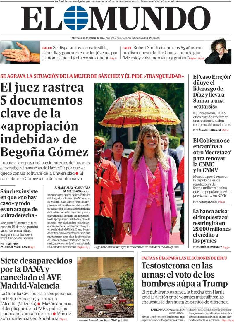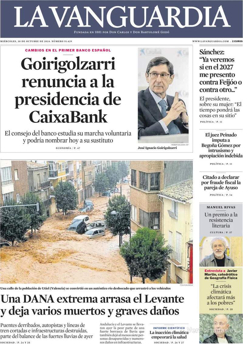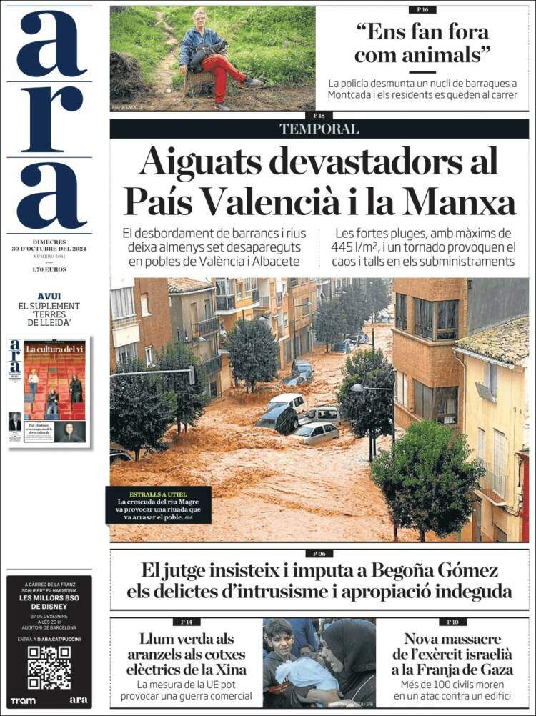 L'altre tema que ocupa la majoria de titulars aquest dimecres són els desastres que està causant la terrible DANA que afecta, sobretot, el País Valencià i Albacete. El País titula: "El temporal devasta Albacete i València i deixa set desapareguts". Desgraciadament, aquest titular ja queda antic perquè el president de la Generalitat valenciana, Carlos Mazón, va confirmar, a última hora, la troballa de diverses víctimes mortals en zones inundades de la seva comunitat, encara que no va precisar ni la ubicació ni la xifra provisional, perquè encara no s'ha pogut comunicar als familiars. Rius desbordats, carreteres tallades, carrers negats i milions d'euros en danys són uns fets que s'han produït en diferents punts del País Valencià, Andalusia, Castella-la Manxa i Múrcia. El govern espanyol ha constituït un gabinet de crisi i ha ofert els efectius de la Unitat Militar d'Emergències a totes les regions afectades. La Razón, per la seva banda, destaca que la DANA ha destrossat prop de 4.500 hectàrees d'hivernacles a Almeria i afegeix que les pluges han obligat a suspendre l'alta velocitat entre Madrid i València.