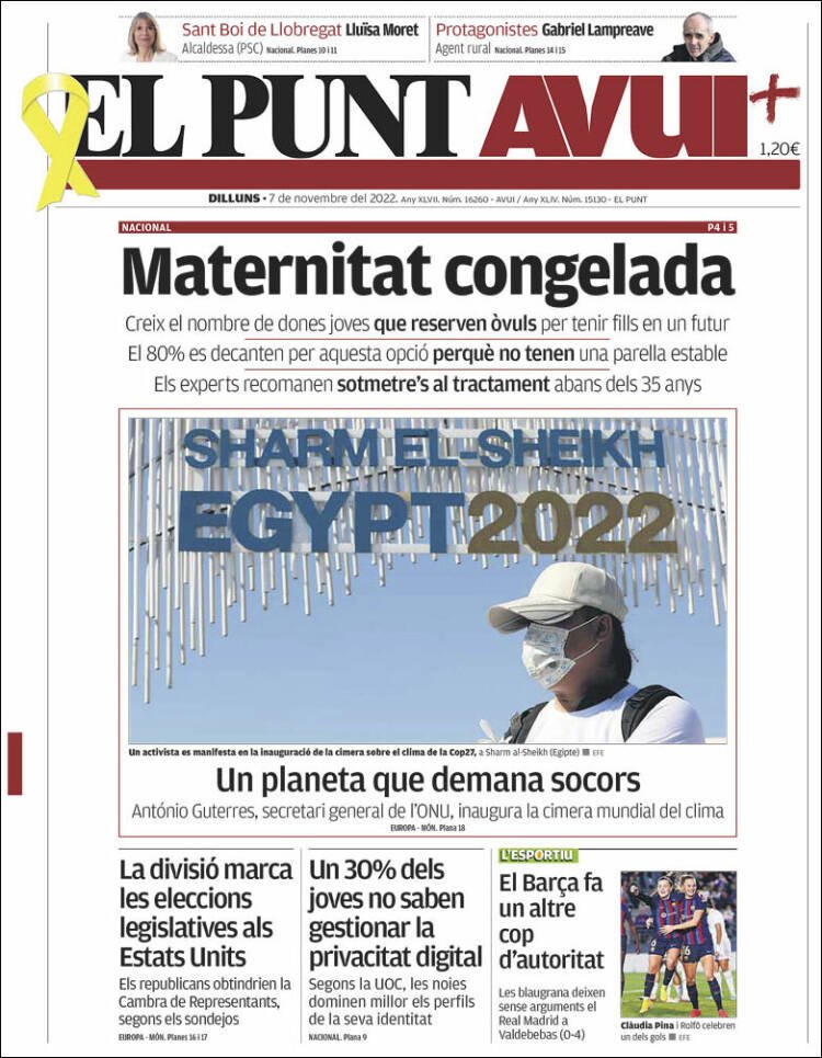 "Maternitat congelada". Aquest és el titular central d'El Punt Avui que explica que cada vegada hi ha més dones que opten per congelar els seus òvuls i així tenir fills en un futur, a més afegeix que el 80% de dones que ho fan és perquè actualment no tenen una parella estable. La imatge és per a la cimera mundial del clima, que va arrencar aquest diumenge a Sharm al-Sheikh, Egipte. La COP27 durarà dues setmanes i hi participaran 40.000 delegats, inclosos més d'un centenar de caps d'Estat i de govern que arribaran en 130 avions presidencials.