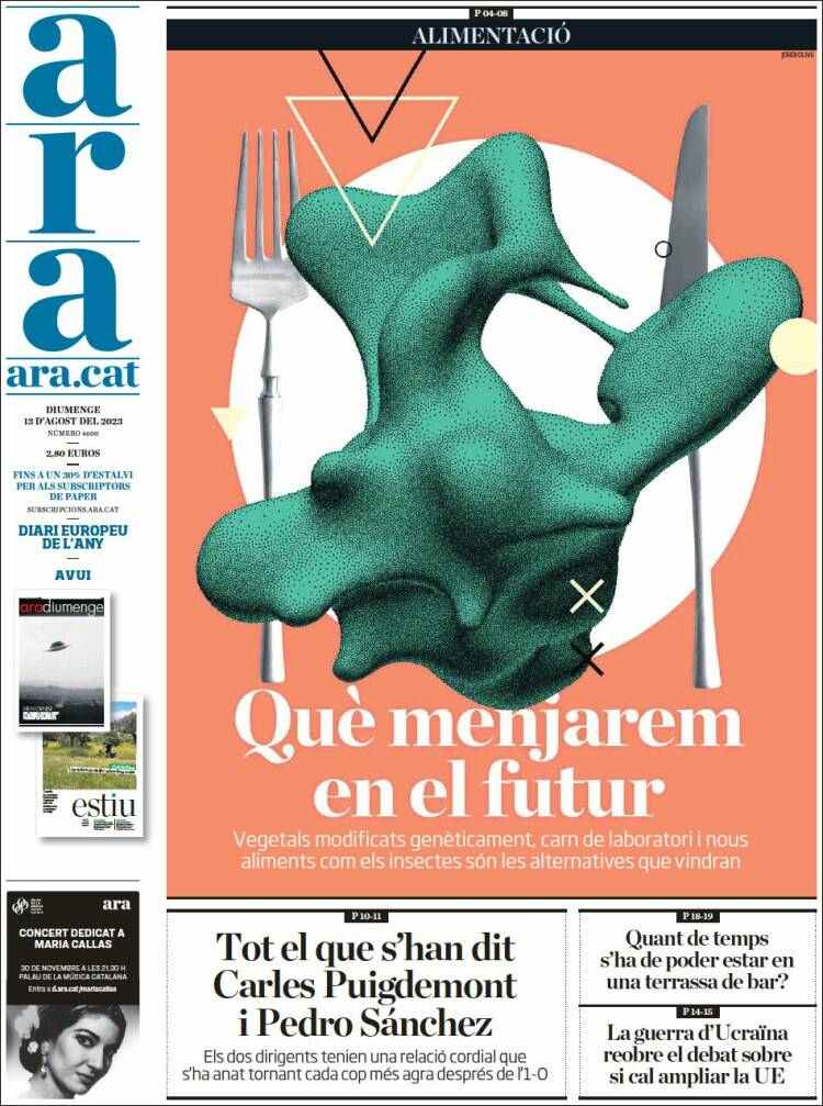També el Diari Ara, dona gran part del protagonisme a la seva portada a un reportatge, en aquest cas preguntant-se: "Què menjarem en el futur". A més, destaquen un article en què recullen la relació que han tingut al llarg dels anys Pedro Sánchez i Carles Puigdemont, ja que l'ombra de les negociacions pel govern de l'Estat espanyol no abandona pràcticament cap portada.