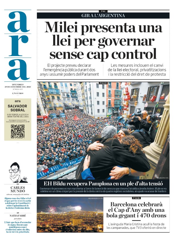 Enmig de la batalla navarresa, hi ha qui opta per donar protagonisme a altres qüestions. Així El Periódico ens fa una fotografia de com el pic de la grip que s’està registrant aquests dies està tensant els serveis d’urgències, amb un increment del 30% de la pressió assistencial. Per la seva banda, l’Ara viatja fins a l’Argentina de Milei, que pretén governar sense cap control i amb poders extraordinaris, i El Punt Avui recull l’acord del govern espanyol per cedir al Govern la construcció de la B-40.