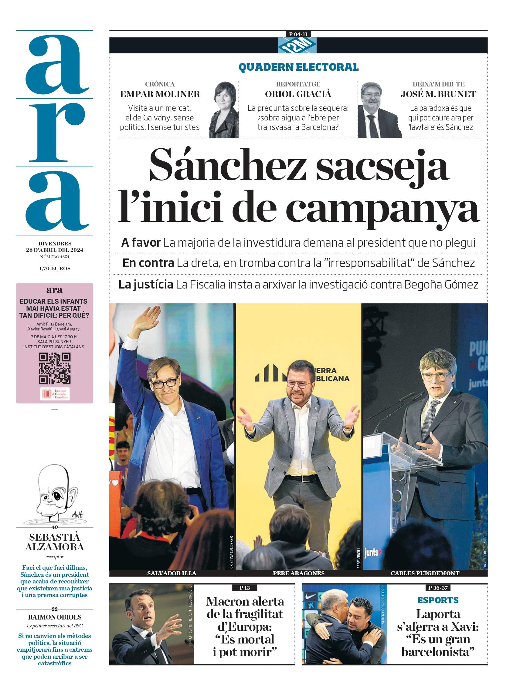 D’entrada podia semblar que només els diaris governamentals aprofitarien la retirada parcial de Pedro Sánchez per rebaixar la presència de la campanya electoral a Catalunya en portada. Però no. No només La Vanguardia i El País obren la primera pàgina amb la sortida del president espanyol. La resta també —El Punt Avui no, etcètera, i tampoc El Periódico, que titula amb allò que el mateix diari ens dirà aquests quinze dies que venen, que és com fer campanya però de sí mateix. El títol de l’Ara és ideal per al Quioscos & Pantalles d’aquest divendres: “Sánchez sacseja l’inici de campanya”. Ni Puigdemont, ni cas Koldo, ni cas Ayuso, ni res. Potser aquesta és la idea que motiva al president del govern espanyol.