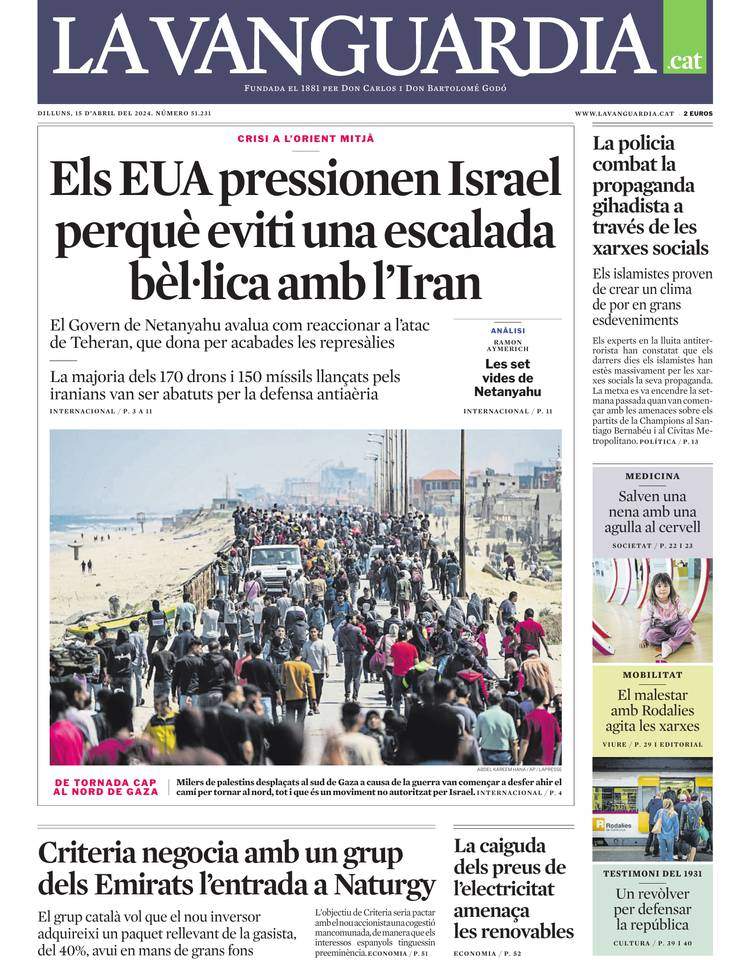 Aquest dilluns sí. Totes les portades estan expectants. Ara que l'Iran ha fet el que mai no havia gosat fer —atacar directament Israel des del seu territori—, què passarà? Quines conseqüències tindrà l'eixam de 350 aparells, entre drons (més de 170) i míssils balístics (120) i de creuer (30), llançats simultàniament des de la república islàmica, des de les posicions houthis al Iemen, des dels camps de les milícies xiïtes a l'Iraq? El món sencer s’ho pregunta i també les portades, és clar. El Mundo deixa anar una mica d’esperança: Israel, de moment, sembla que no replicarà tot seguit, segons el tabloide ultra. La Vanguardia s'hi afegeix des d’una altra perspectiva: els Estats Units —de fet, tothom— reclamen a Israel que ho deixi estar aquí. Al capdavall, el 99% dels aparells iranians van ser tombats per les forces israelianes o les dels seus aliats i veïns, resultat que no deu haver estat cap sorpresa pels aiatol·làs. Fins ara, no ha mort ningú a conseqüència de l’atac. Sembla més una resposta destinada a salvar l’honor ferit dels iranians i a dissuadir Israel que repeteixi el bombardeig d’un edifici de l'ambaixada de l'Iran a Síria en què van morir vuit caps militars de la república islàmica.