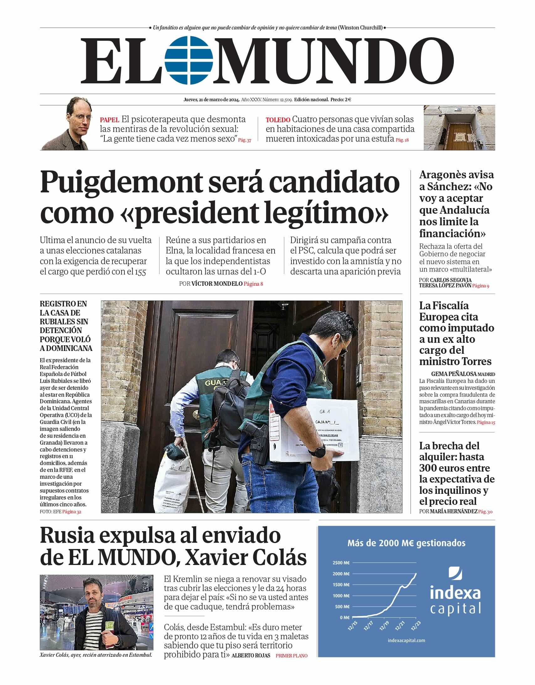 L’única notícia que és a totes les portades d’aquest dijous és l’escorcoll de la seu de la Federació Espanyola de Futbol, la casa de l’expresident Luis Rubiales i una desena més de domicilis per suposades irregularitats en els contractes de la Supercopa d’Espanya amb l’Aràbia Saudita. Hi ha set arrestats i entre ells no hi figura Rubiales perquè fa setmanes que és a la República Dominicana. El jutge investiga presumptes delictes de corrupció en els negocis, administració deslleial i blanqueig de capitals. Un dels contractes en qüestió és el de la RFEF amb Kosmos, l'empresa de la qual és fundador i president l’exfutbolista del Barça, Gerard Piqué, valorat en 264 milions d’euros. La majoria de les portades han triat la foto de l’escorcoll a la federació, excepte El Mundo, que s’ha estimat més publicar la imatge dels agents sortint de la casa de Rubiales. És la mateixa porta des d’on la mare de l’exdirigent va anunciar que començava una vaga de fam arran del cas del petó indesitjat de Rubiales a la futbolista Jenni Hermoso.