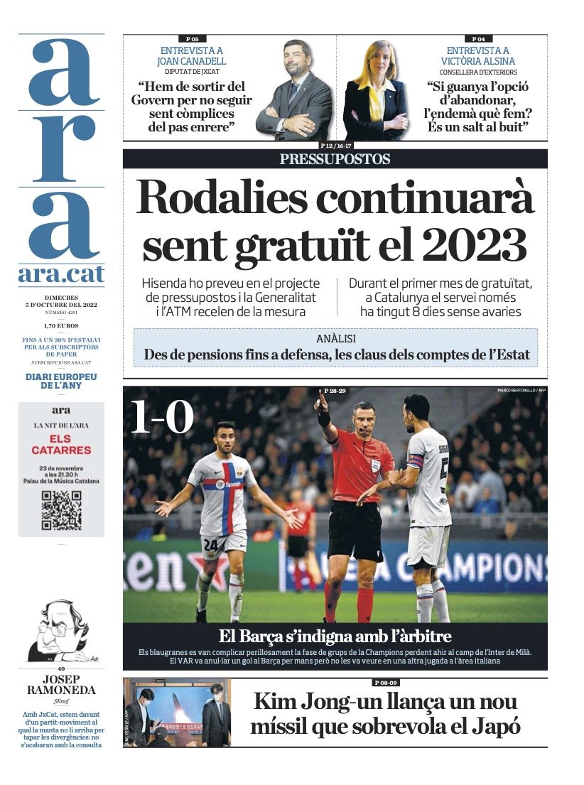 L’Ara se centra en un compte pressupostari concret: Rodalies, que continuarà sent de franc l’any que ve. Almenys és una opció pròpia. En un subtítol punxa una mica el globus de la gratuïtat: en un mes, el servei només ha funcionat amb normalitat una setmana. És a dir, que la gratuïtat no és res de res, perquè el servei no es presta o es presta malament. El Punt Avui, que coneix el seu públic, obre portada amb el circ de cinc pistes de Junts, que ha posat en mans de la militància seguir o no seguir al Govern. Mira, té la seva cosa que un diari aposti per desmentir el tòpic que considera els partits artefactes hermètics i sense debat, encara que arribi amb una oportunitat més que dubtosa. No és culpa del diari.