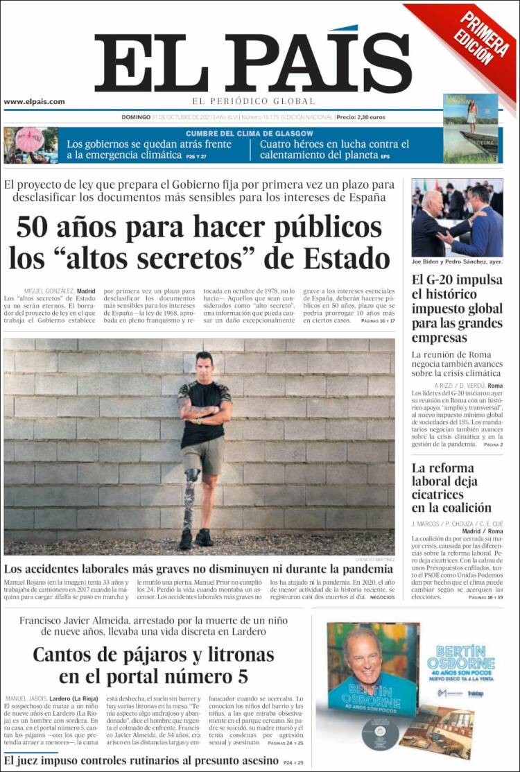 El País avança el projecte de llei en el qual treballa el govern espanyol sobre la desclassificació de documents secrets: "50 anys per fer públics els 'alts secrets' d'Estat". També reserva un espai per a l'import de societats global: "El G-20 impulsa l'històric impost global per a les grans empreses".