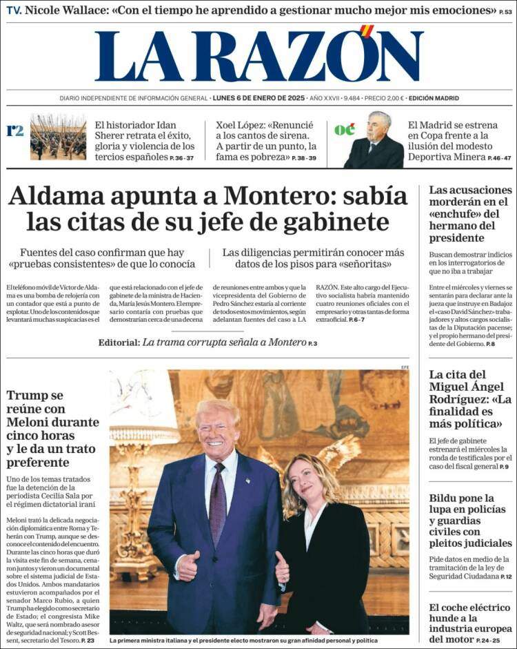 La Razón, per la seva part, obre la seva portada assegurant que “Aldama apunta Montero: sabia les cites del seu cap de gabinet”. Traduït al llenguatge més planer, la informació intenta demostrar la connexió entre l'aconseguidor del cas Koldo, Víctor de Aldama, i el govern de Sánchez, a través de la vicepresidenta i ministra d’Hisenda, Maria Jesús Montero i, en concret, el seu cap de gabinet. Segons el rotatiu de Planeta, que ha tingut accés a fonts del cas, aquest alt executiu de socialista del Govern de Sánchez hauria mantingut quatre reunions oficials amb Aldama i altres tantes de manera extraoficial, i asseguren que Montero estava al corrent de tots aquests moviments, segons les proves que sembla que Aldama hauria aportat.