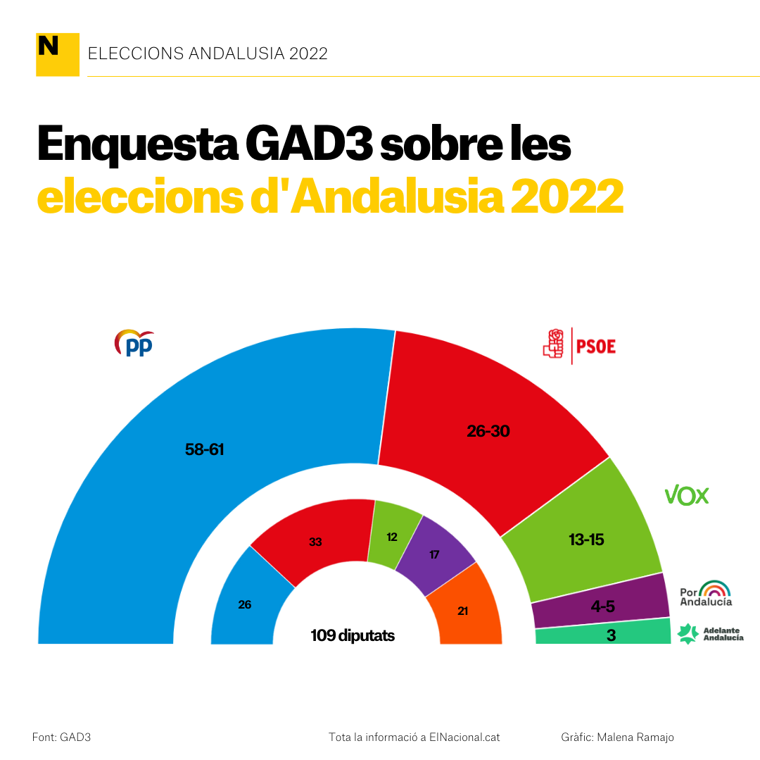 Andalusia consolida el canvi de color. El Partit Popular, liderat per l'actual president de la Junta, Juanma Moreno, ha guanyat aquest diumenge les eleccions autonòmiques amb una diferència aclaparadora, segons informa l'enquesta a peu d'urna de la consultora GAD3 per a Canal Sur. Amb aquesta victòria, els conservadors aconsegueixen la majoria absoluta per primer cop a Andalusia, territori que des de la Transició i fins al 2018 havia governat el PSOE. A les darreres eleccions va imposar-se la dreta, però els socialistes van ser igualment la primera força a la regió.