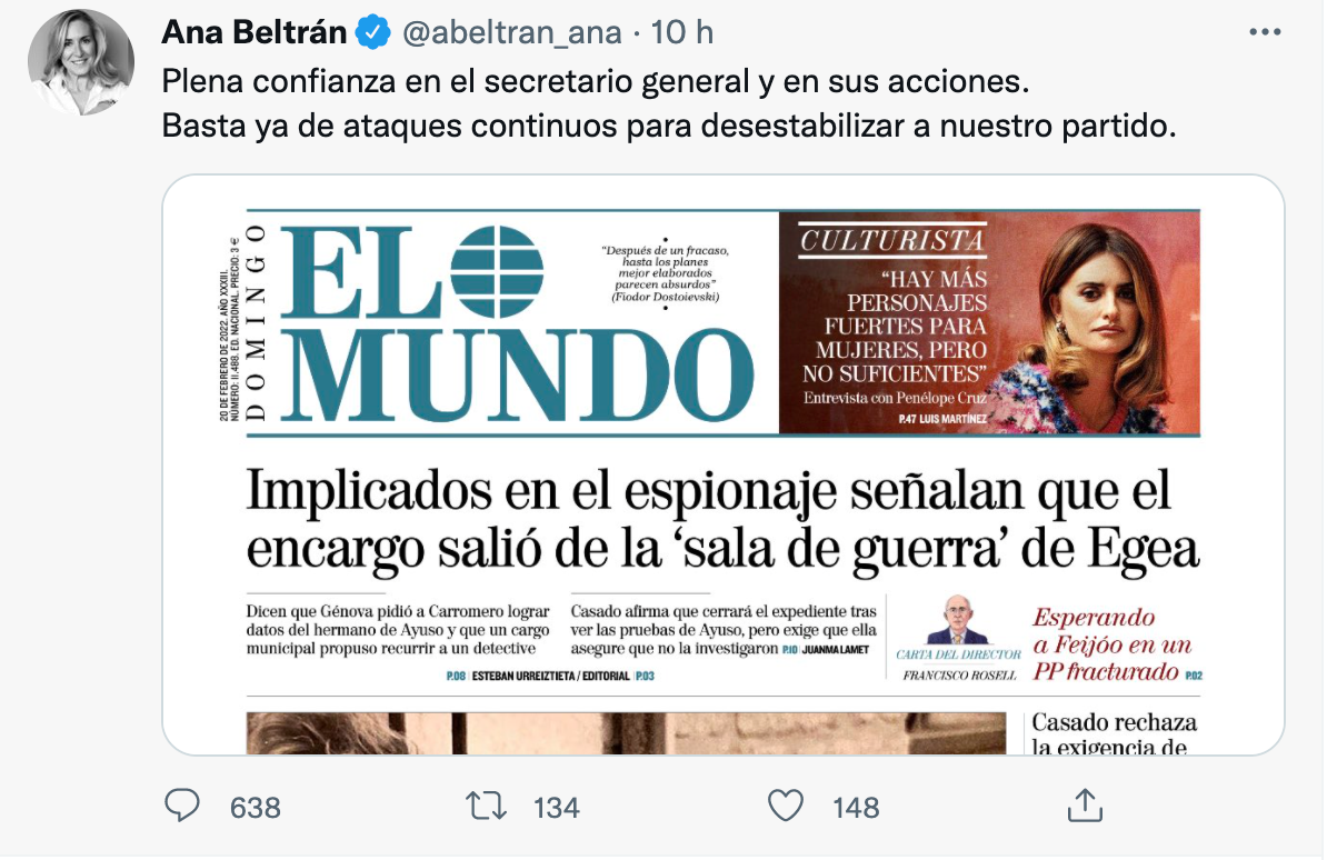 Aquest diumenge, la vicesecretària d'organització del PP, Ana Beltrán, ha reaccionat a la informació en portada del diari El Mundo fent costat a la direcció del partit i intentant mostrar una estabilitat interna. "Plena confiança en el secretari general i les seves accions. Ja n'hi ha prou d'atacs continuats per desestabilitzar el nostre partit", ha carregat en una piulada.