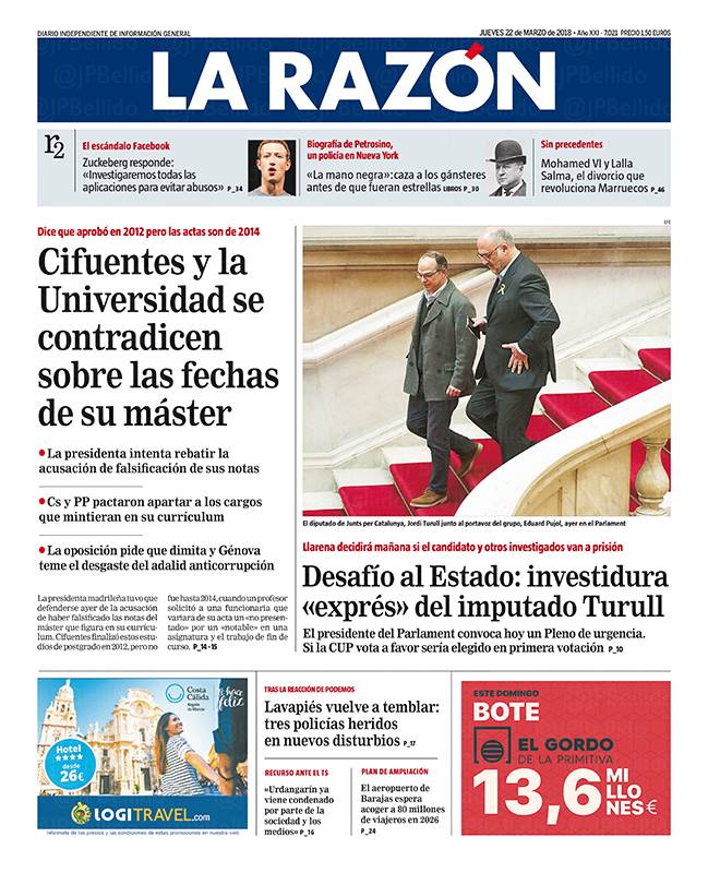 La Razón dona gairebé per fet que el jutge del Suprem enviarà a la presó els diputats independentistes citats per a demà i sosté, precisament per això, que podria ser que el magistrat "imposés mesures cautelars de presó" i, per tant, es podria arribar a inhabilitar Jordi Turull encara que ja sigui president.