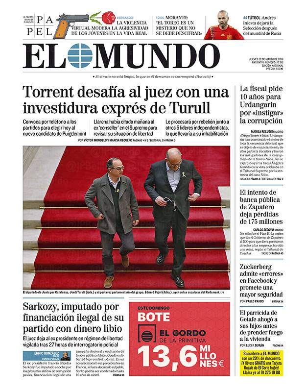 El Mundo té clar que Catalunya "continuarà privada de l'autogovern que li reconeixen la Constitució i l'Estatut" i insisteixen que "existeix la possibilitat que Turull ingressi en presó preventiva demà mateix". Ara bé. Sostenint que encara que Llarena demà no enviï a la presó els diputats sobiranistes, aquest rotatiu assegura que "la seva inhabilitació acabarà arribant més aviat que tard".