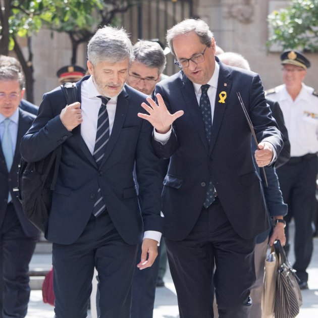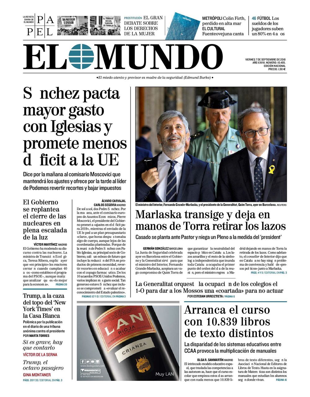 Amb aquest panorama, no és d’estranyar que El Mundo tituli la informació referent a aquesta qüestió de la següent manera: Marlaska transige y deja en manos de Torra retirar los lazos. Transigir, com apaivagar, no és cap verb innocent, i en aquest cas el diari madrileny es dol que de que no hi hagi cap compromís efectiu per retirar "los lazos amarillos y el resto de la simbología independentista que inunda toda Catalunya. Que titllin els llaços grocs de simbologia independentista ja demostra el grau de desenfocament de tot plegat, però que a sobre, la seva eventual retirada quedi en "manos de Torra” i que Buch parlés de “presos políticos” al costat del ministre els deuria regirar l’estómac. D'aquí, potser, la imatge de portada, amb un Guàrdia Civil amb el seu tricorni vigilant de prop el president de la Generalitat.
