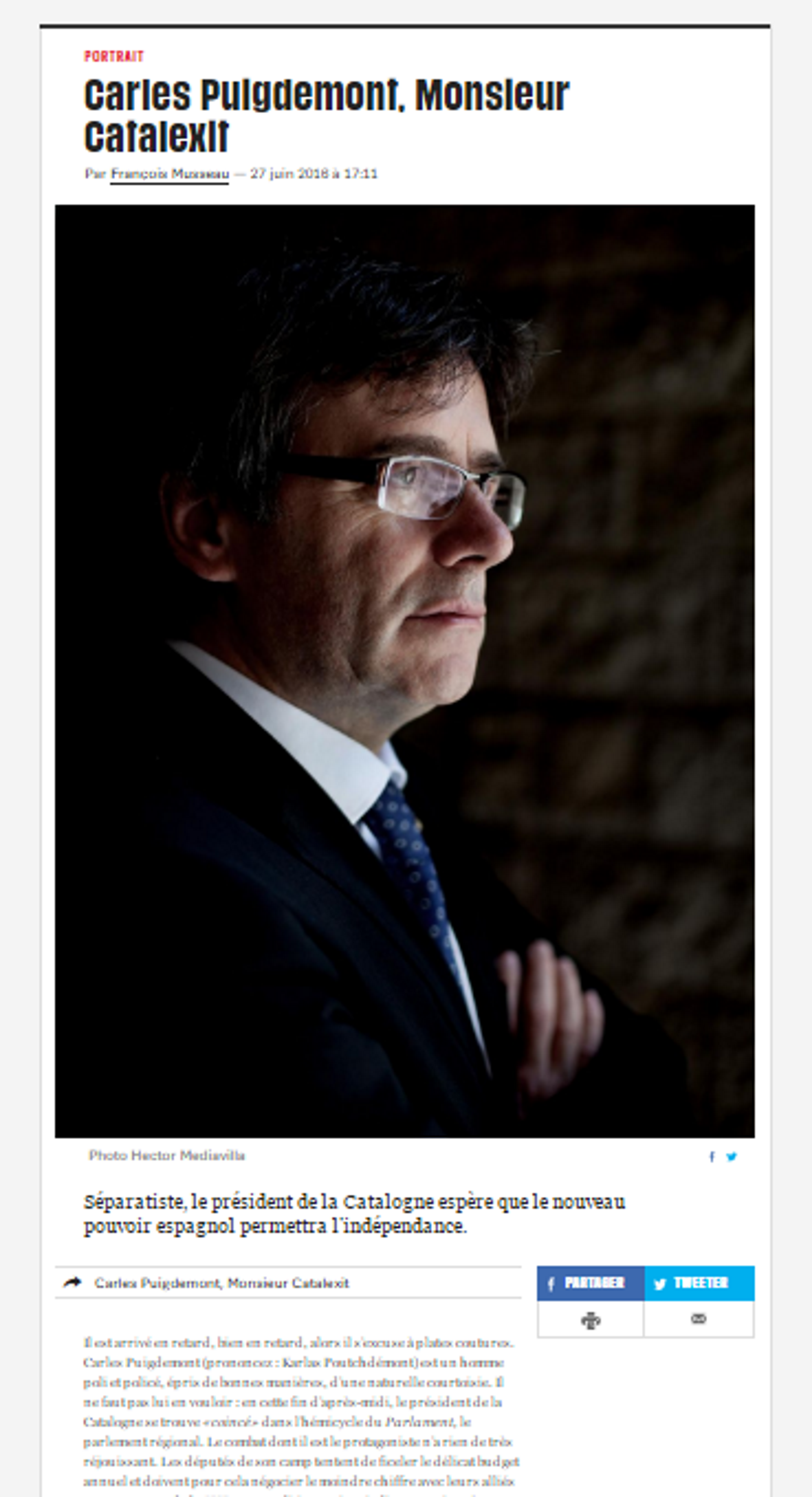 El diari parisenc Libération ha publicat aquest dilluns un perfil del president de la Generalitat, Carles Puigdemont, titulat "Carles Puigdemont, Monsieur Catalexit". La peça, signada per François Musseau, recull d'aquesta manera l'efecte que pugui tenir el Brèxit –la sortida del Regne Unit de la Unió Europea, decidida dijous passat en referèndum– sobre les demandes dels independentistes catalans respecte de l'Estat espanyol.