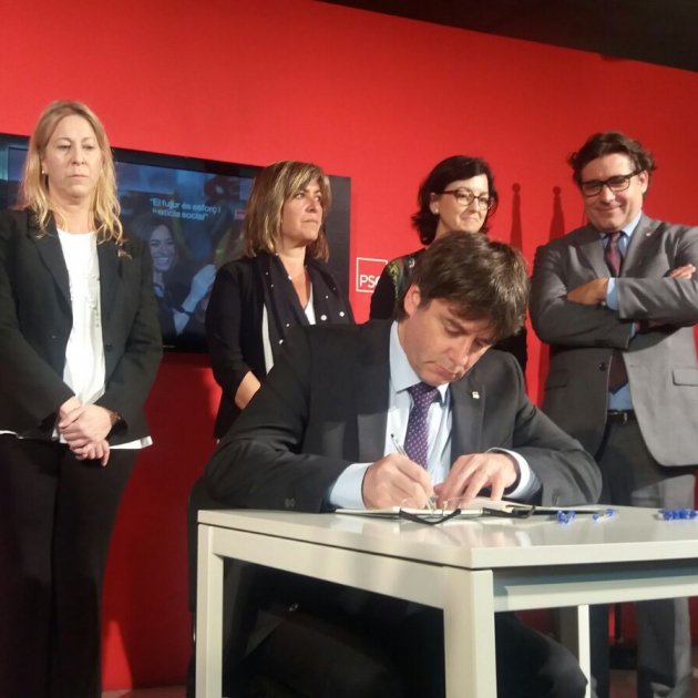 El president de la Generalitat, Carles Puigdemont, ha assistit aquesta tarda a la seu del PSC com a gest de condol per la mort de l’exministra socialista Carme Chacón.