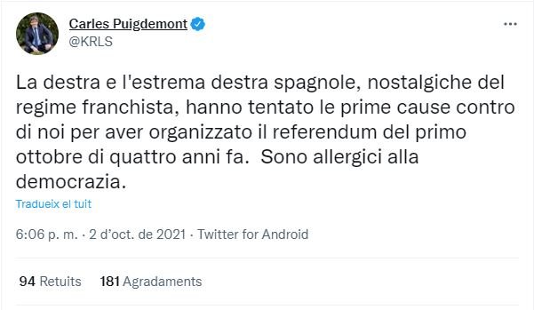 Poc després, el president de Junts, Carles Puigdemont, ha fet un fil a Twitter explicant que som davant d'un clar "exemple de persecució política": "La dreta i l'extrema dreta espanyola, nostàlgiques del règim franquista, van intentar actuar contra nosaltres per haver organitzat el referèndum de l'1 d'octubre de fa quatre anys. Són al·lèrgiques a la democràcia".