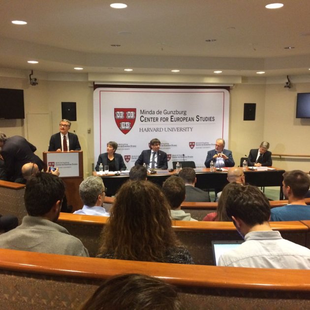 La conferència del president, Carles Puigdemont, a la Universitat de Harvard no ha estat precisament una passejada. La presència entre els ponents d'un exdiputat del PP i professor a Harvard, José María Beneyto, o les referències d'un estudiant espanyol a l'okupació aquest dilluns de la seu del PP de Barcelona per part de la CUP han introduït moments de major tensió.