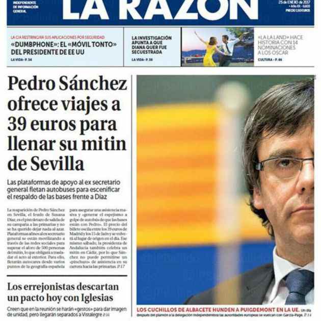 El PSOE, el Brèxit, Donald Trump, Mariano Rajoy... aquests són alguns dels temes que centren les portades de El País i l'ABC, al temps que ignoren completament la visita del president del Govern, Carles Puigdemont, el vicepresident, Oriol Junqueras, i el conseller d'Afers Exteriors, Raül Romeva, a Brussel·les per explicar el procés a Europa, però qui més demostra capacitat d'imaginació a l'hora d'intentar minimitzar, i fins i tot, ridiculitzar la conferència del president és el diari madrileny La Razón, que sí que parla del periple europeu de Puigdemont per comparar-lo amb... els ganivets d'Albacete.