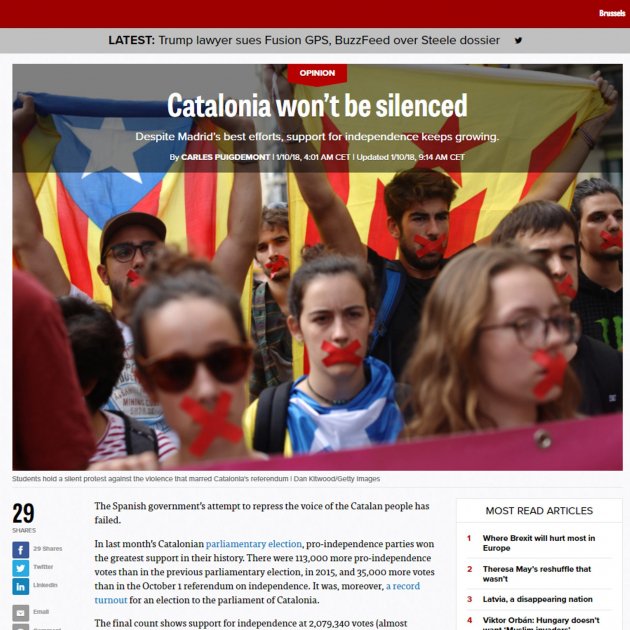 El candidat de Junts per Catalunya, Carles Puigdemont, vaticina que alguns líders europeus "continuaran mantenint el silenci davant d'un govern [l'espanyol] que aparentment no accepta els resultats d'unes eleccions". En un article d'opinió publicat aquest dimecres a Politico, Puigdemont reconeix no estar "sorprès" però sí "decebut" amb l'actitud d'alguns líders a Europa i defensa que el suport "incondicional" a Rajoy des de la Unió Europea no ajuda a resoldre un problema "que és real".