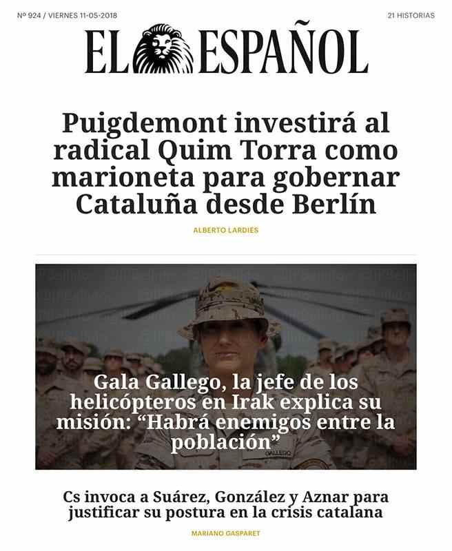 Com els altres dos diaris, El Mundo obre la seva portada amb la candidatura de Torra i, també com la resta, consideren que "Puigdemont designa una titella per continuar amb la seva rebel·lió" i "perpetuar el desafiament", "conscient que la perpetuació del conflicte amb l'Estat és l'única basa que el salva encara de la irrelevància".