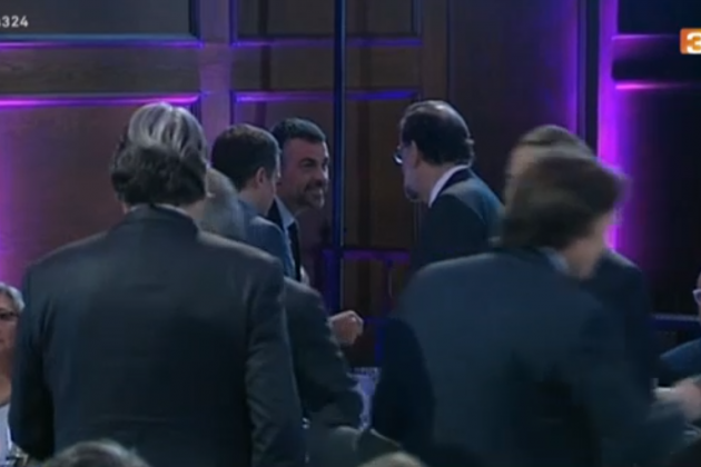 En el moment d'entrar a la sala, Rajoy ha passat entre les taules per dirigir-se a la de Vila, al fons de la sala. Allà, s'ha aturat i ha donat la mà a l'exconseller, qui s'ha aixecat de la cadira per intercanviar unes paraules amb el cap de l'executiu. La salutació ha durat uns segons, fins que Rajoy ha continuat el camí cap a la seva taula acomiadant-se de Vila i altres comensals que seien amb ell amb un gest amb la mà.