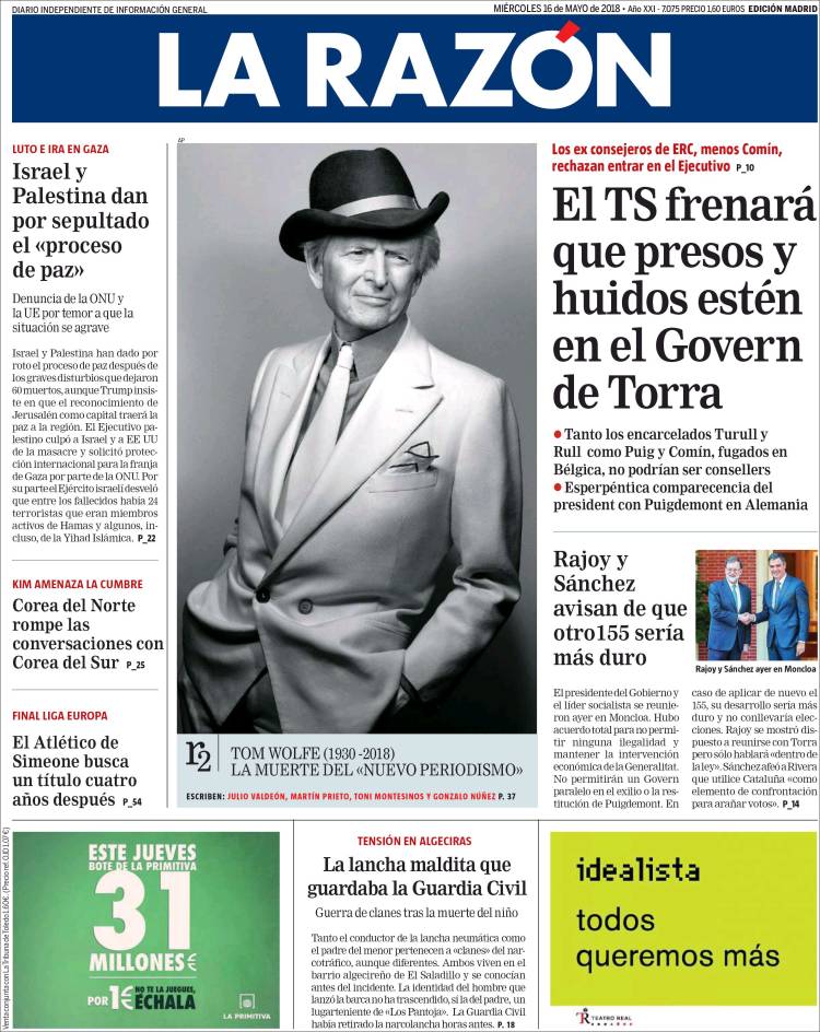 La intenció del president investit, Quim Torra, de restituir tots els consellers que així ho demanin, i que en principi concerniria als consellers Rull i Turull, empresonats a Estremera, i Comín i Puig, exiliats a Bèlgica, no entra dins els plans del diari ‘La Razón’, que ja engreixa la maquinària per a que el Tribunal Suprem impedeixi que aquests quatre consellers puguin exercir el seu càrrec.