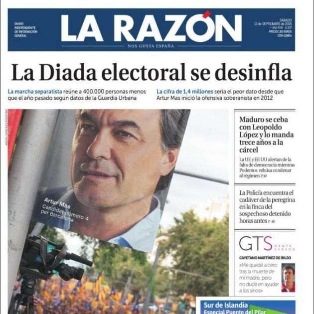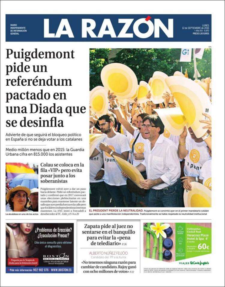 La Razón ha posat a la Diada de 2016 el mateix titular que l'any passat: "la Diada se desinfla". És la mateixa portada, amb la diferència que aquest any el culpable no és Artur Mas sinó Carles Puigdemont. No són ben bé iguals, per això: a Mas li retreuen que no hi assisteixi ("El Presidente ausente") i a Puigdemont que hi vagi ("El President pierde la neutralidad"). Mas és "presidente" i Puigdemont "President". És un canvi destacable de criteri editorial.