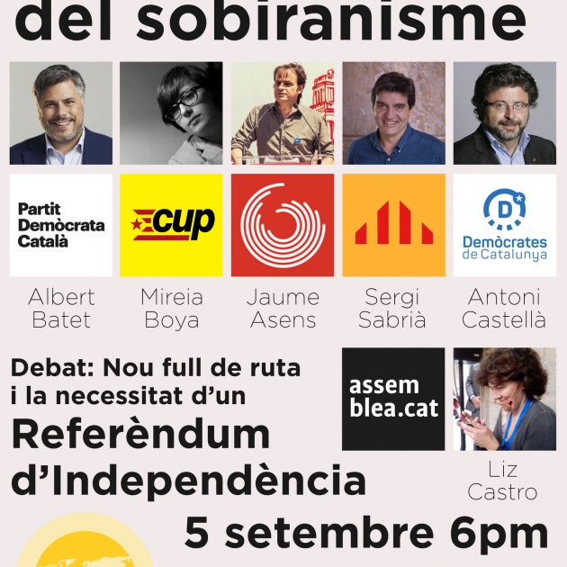 En el marc de la ’Catalan Weekend’ que se celebra aquesta setmana a la capital anglesa, aquest vespre han coincidit en un col·loqui celebrat per l’ANC, representants polítics catalans de partits independentistes o sobiranistes: Albert Batet (PDC), Sergi Sabrià (ERC), Mireia Boya (CUP), Antoni Castellà (Demòcrates) i Jaume Asens (BComú), a més de Liz Castro, per part de l’Assemblea.