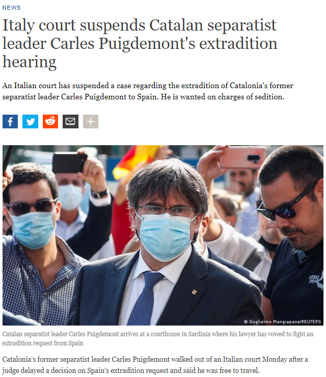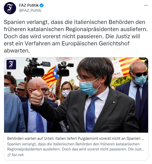 "Espanya exigeix a les autoritats italianes l'extradició de l'expresident regional català. Però això no ocorrerà de moment. El poder judicial vol esperar primer el procediment en el Tribunal de Justícia de les Comunitats Europees".