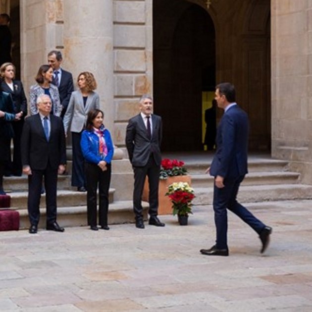 El servei de protocol de la Moncloa no ha escatimat esforços i ha format dues banderes espanyoles amb ponsèties, perquè la fotografia de família de Sánchez i els ministres quedés ben eloqüent. Les flors han quedat dipositades de forma simètrica als laterals de l'escala. Molt d'esforç de protocol, però poques persones se n'han adonat.