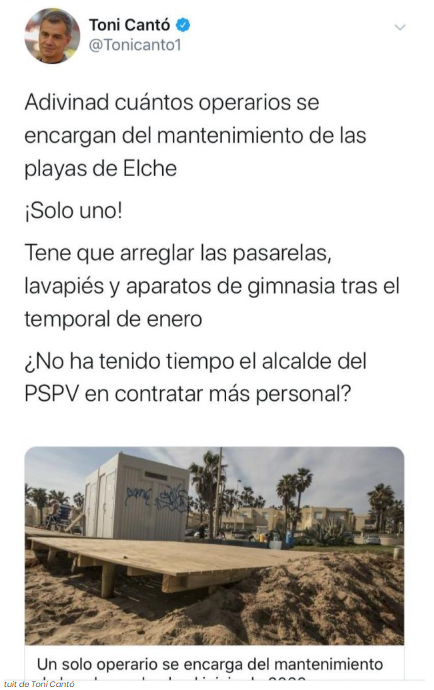 Cantó, que ja ha esborrat el tuit, mencionava la notícia i escrivia: "Endevineu quants operaris s'han encarregat del manteniment de les platges d'Elx. Només un!". I s'exclama mentre cita una altra població i carrega contra el govern socialista d'Elx, que no té res a veure amb la notícia: "No ha tingut temps l'alcalde del PSPV per contractar més personal?".