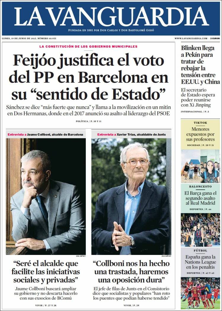 A La Vanguardia Feijóo justifica el seu vot a Barcelona. El líder del PP va fer una crida aquest diumenge a aconseguir una majoria "suficient" el 23-J per "trencar de manera definitiva la política de blocs". "Només ho farem des del govern espanyol amb una majoria sòlida i suficient per obrir un altre cop Espanya als espanyols", va dir Feijóo, que ha afegit que "ja n'hi ha prou" que a Espanya "s'enrareixi el dia a dia de la societat des de la política". En relació a les eleccions municipals i a la constitució dels ajuntaments Feijóo va assegurar que ha demostrat que "ha començat el canvi polític a Espanya". De fet, segons va remarcar, el PP s'ha convertit en "hegemònic" a l'Estat. Les fotografies són per a Jaume Collboni i Xavier Trias i van acompanyades de dues cites seves: "Seré l'alcalde que faciliti les iniciatives socials i privades" i "Collboni ens ha fet una trastada, farem una oposició dura", respectivament.