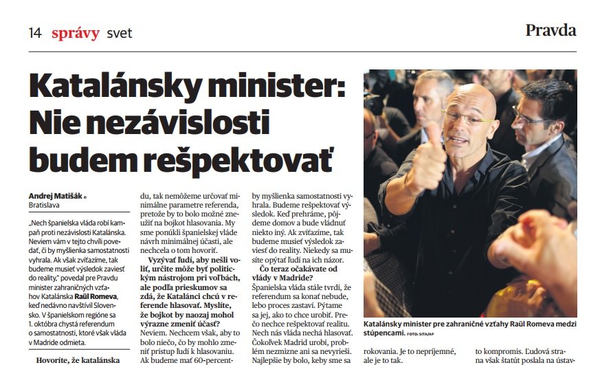 El conseller d'Afers Exteriors, Raül Romeva, ha assegurat en una entrevista al principal diari d'Eslovàquia, el Prvada, que si l'1-O el no guanya en el referèndum, el Govern respectarà el resultat i convocarà eleccions."Si perdem, marxarem a casa, ja governarà algú altre", ha assegurat Romeva.