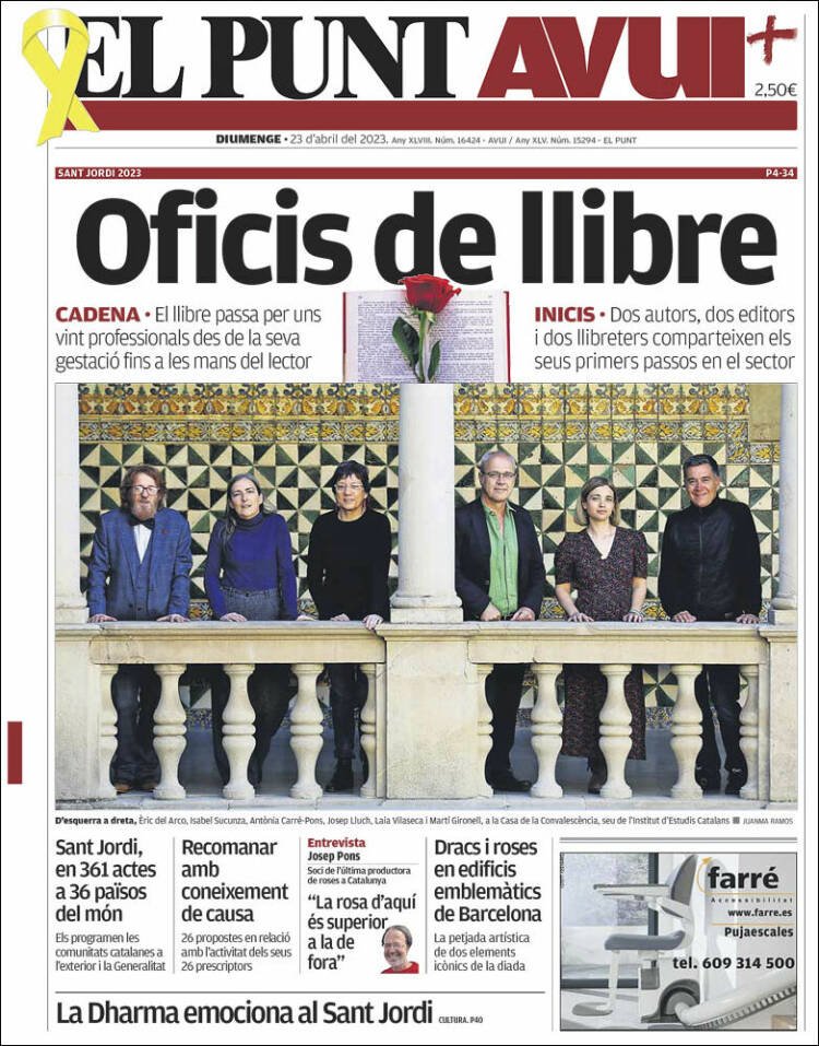 Alto el foc, treva i un respir. Un Sant Jordi que, a més, cau en diumenge, dia del relax per antonomàsia. Les portades, almenys les dels diaris publicats a Catalunya, aparquen el conflicte i la rabiosa actualitat per centrar-se en la celebració del dia del llibre i la rosa. Els diaris editats a Barcelona escombren els problemes de la primera plana i ens presenten imatges i titulars que ens conviden avui a sortir al carrer, passejar entre parades i remenar entre tota l’oferta disponible.