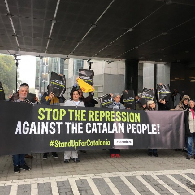 Els manifestants, una vintena, porten una pancarta amb el lema "Stop the repressions against the catalan people" (pareu la repressió contra els polítics catalans) i protesten contra la sentència del judici al procés, que ha condemnat els dirigents independentistes a 99,5 anys de presó.