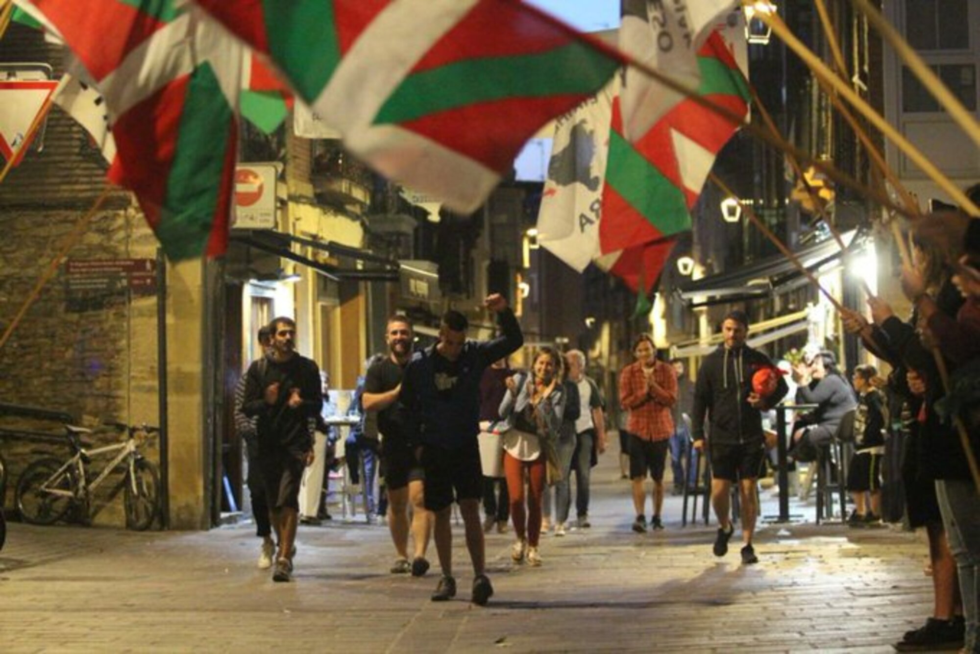 Ahora mismo se le está haciendo este ongietorri por todo lo grande a la #etarra Lorentxa Beyre en Cambó (Francia), cientos de personas, muchos niños, sin ninguna medida sanitaria.
