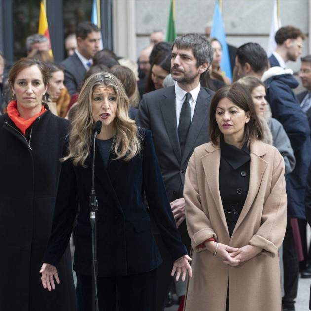 La posició constructiva de Sumar, tot i el malestar, contrasta amb la de Podem, que no ha tingut cap dubte a qualificar Sánchez de "cadàver polític" sense credibilitat i ha desafiat Sumar, com també li va exigir el PP, a sortir del govern de coalició amb el PSOE. Malgrat que l'espai de Yolanda Díaz intenta tancar files, el cert és que hi ha inquietud entre els seus molt diversos components per l'evolució de la crisi al PSOE i la seva possible afectació electoral, també per al soci minoritari. Així, el diputat al Congrés de Chunta Aragonesista (CHA), Jorge Pueyo, ha anunciat que la formació, integrada al grup parlamentari plurinacional de Sumar, es plantejarà en els pròxims dies la relació amb el PSOE en funció de la resposta que doni als escàndols. "Exigim una resposta ja. La nostra paciència amb aquest govern no aguanta més", ha advertit Pueyo.