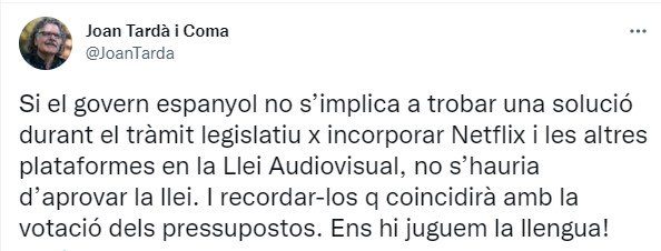 L'exportaveu d'Esquerra Republicana al Congrés dels Diputats, Joan Tardà, ha avisat al govern espanyol que si no s'incorpora Netflix i les altres plataformes a la llei audiovisual, "no s'hauria d'aprovar" i recorda que "coincidirà amb els pressupostos".