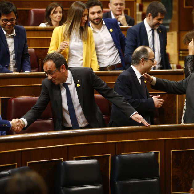 Tampoc han captat les càmeres de televisió el moment en què Junqueras ha saludat el president del govern en funcions, Pedro Sànchez, quan ha passat per davant d’ell just després de votar. Fotògrafs presents a la sala si que han captat aquest instant. Tampoc no hi hagut imatge televisiva de la salutació de Jordi Sànchez al president espanyol.