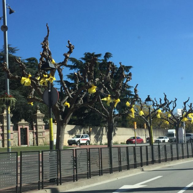 La passada nit s'han penjat llaços grocs als arbres, fanals i bancs i també s'han fet pintades al terra reclamant la llibertat dels presos polítics.