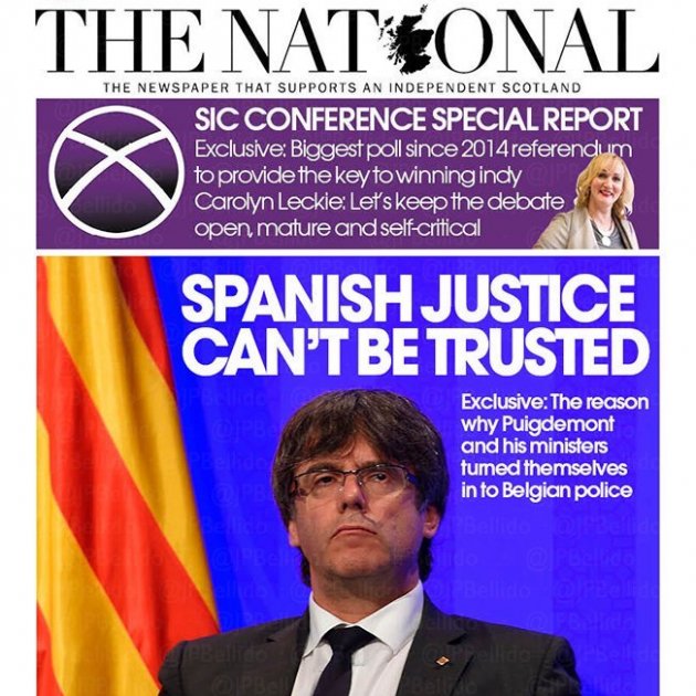"No es pot confiar en la justícia espanyola". És el que sentencia la portada del diari escocès The National en l'edició d'aquest dilluns. La frase va acompanyada d'una fotografia del president Carles Puigdemont. A la portada, el rotatiu promet una exclusiva amb "la raó per la qual Puigdemont i els seus consellers s'han entregat a la justícia belga".