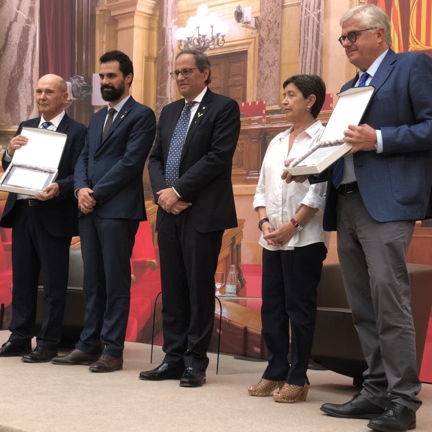 El president, Quim Torra, el president del Parlament, Roger Torrent, i la delegada del Govern espanyol, Teresa Cunillera, han protagonitzat aquesta tarda una roda de premsa conjunta al Parlament tan inèdita com impensable fa uns mesos. La cita responia a una convocatòria del Col·lectiu Ciutadella, de periodistes polítics. Això no obstant, malgrat compartir un espai de escassos metres, tot just dues rondes de preguntes han estat més que suficients per demostrar que la distància política continua sent sideral.