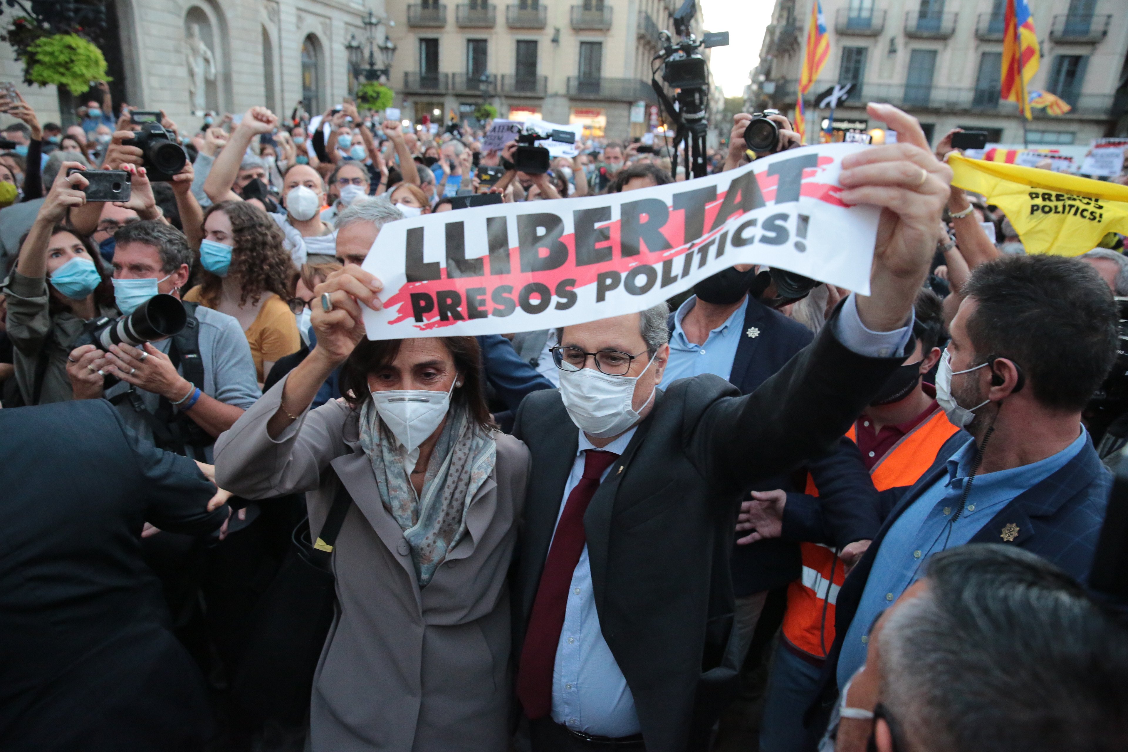 Després d'acomiadar-se del personal de presidència i dels seus col·laboradors, Torra ha sortit a la plaça Sant Jaume on ha exhibit la pancarta que ha provocat la seva inhabilitació. Allà l'esperaven representants de les forces independentistes i els responsables d'Òmnium Cultural, Marcel Mauri, i de l'ANC, Elisenda Paluzie. Tot seguit ha marxat entre la gent.