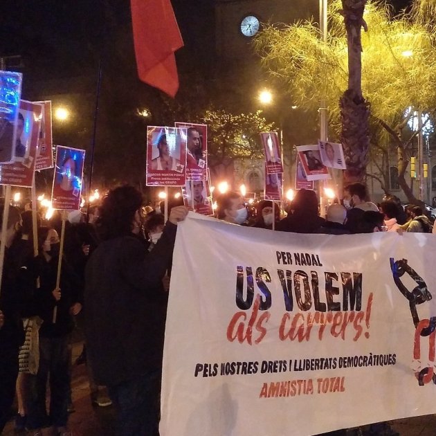 Unes 250 persones, segons el recompte de la Guàrdia Urbana, s'han manifestat aquest dissabte a la tarda contra la repressió amb una marxa de torxes a Barcelona convocada pel col·lectiu Coordinadora Antirepressiva. La protesta ha començat al carrer Pelai i ha avançat per la Rambla cap a la plaça Sant Jaume, amb una capçalera amb el lema 'Per Nadal, us volem als carrers'.