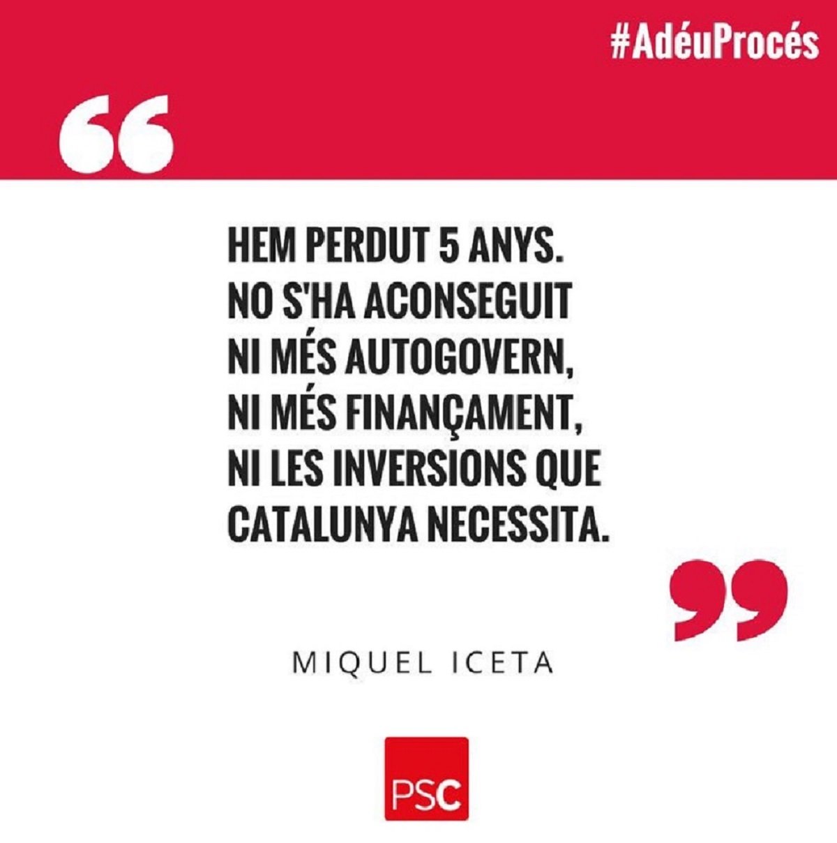 Aquesta darrera opció és la que ha escollit el PSC. Al seu compte de Twitter ha penjar una fotografia amb una frase del primer secretari del PSC, Miquel Iceta, en què diu “hem perdut 5 anys. No s’ha aconseguit ni més autogovern, ni més finançament, ni les inversions que Catalunya necessita”.