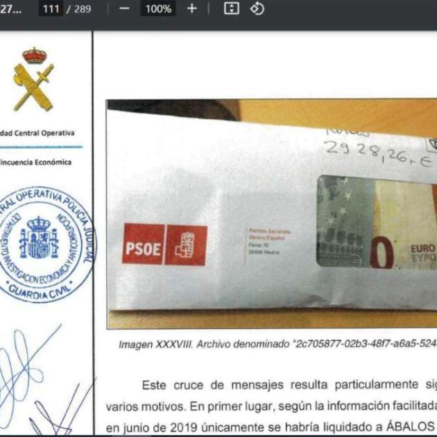 La Unitat Central Operativa (UCO) de la Guàrdia Civil ha detectat més de 95.000 euros en ingressos en efectiu sense declarar de l’exsecretari d’Organització del PSOE José Luis Ábalos. En un nou informe de 300 pàgines sobre la situació financera de l'exministre al qual ha tingut accés ElNacional.cat i que ja ha sigut entregat al jutge del Tribunal Suprem que instrueix el cas, Leopoldo Puente, apareixen fotografies de sobres amb logotips del partit carregats de bitllets. La Guàrdia Civil no descarta que existissin més desemborsaments, però apunta que ha estat capaç de detectar aquesta xifra que s'acosta al centenar de milers d'euros. L'UCO ha detectat que l'ex home de màxima confiança de Pedro Sánchez feia pagaments a persones del seu entorn amb diners que no sortien dels seus comptes bancaris. Apunta a una comptabilitat en B.