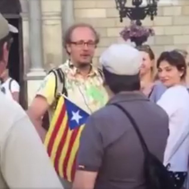 Una quarantena d'espanyolistes, que es van reunir la setmana passada a la plaça de Sant Jaume de Barcelona per manifestar-se a favor de l'unionisme, van increpar un guia turístic que estava fent una ruta amb una bandera estelada a la mà.